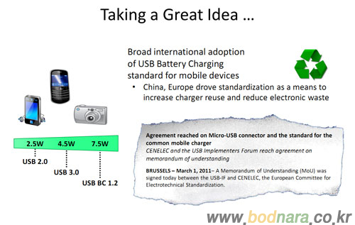 현재 5Gbps 대역폭의 3.0 규격까지 발전한 USB 규격은 지난 2012년 7월 USB 기기의 최대 전력 공급 능력을 100W까지 늘린 Power Delivery 규격이 제정되고, CES 2013에서 제품 시연이 이뤄졌다.